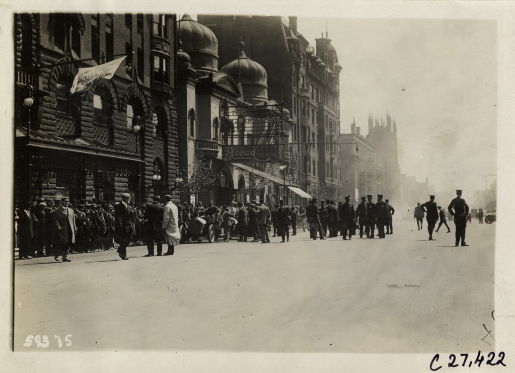 View of cars and spectators in street in front of the Hotel Walton and Broad Street Theatre at Philadelphia, Pennsylvania during the 1910 Quaker City Motor Club Roadability Run. The endurance contest covered a route from Philadelphia, Pennsylvania to Atlantic City, New Jersey. Stamped on back: "Spooner & Wells, Inc., photographers, telephones 3472-3473 Columbus, 1931 Broadway, New York." Handwritten on back: "Tours--Quaker City Motor Club Roadability Run, 1910."