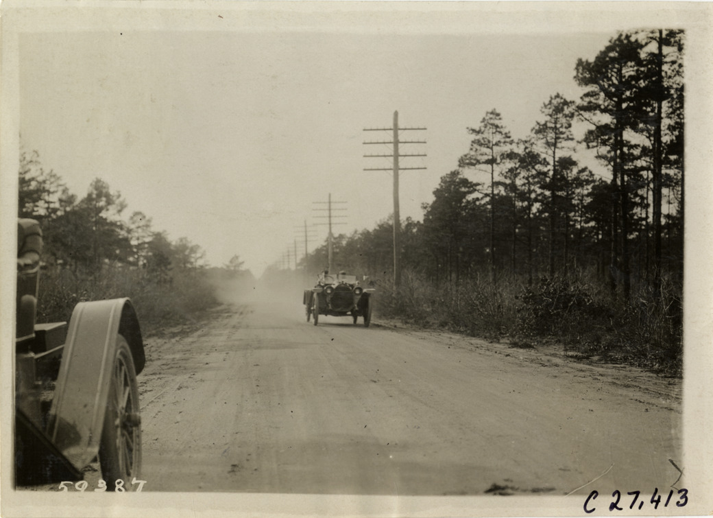 View of car traveling on rural dirt road during the 1910 Quaker City Motor Club Roadability Run. The endurance contest covered a route from Philadelphia, Pennsylvania to Atlantic City, New Jersey. Stamped on back: "Spooner & Wells, Inc., photographers, telephones 3472-3473 Columbus, 1931 Broadway, New York." Handwritten on back: "Tours--Quaker City Motor Club Roadability Run, 1910."
