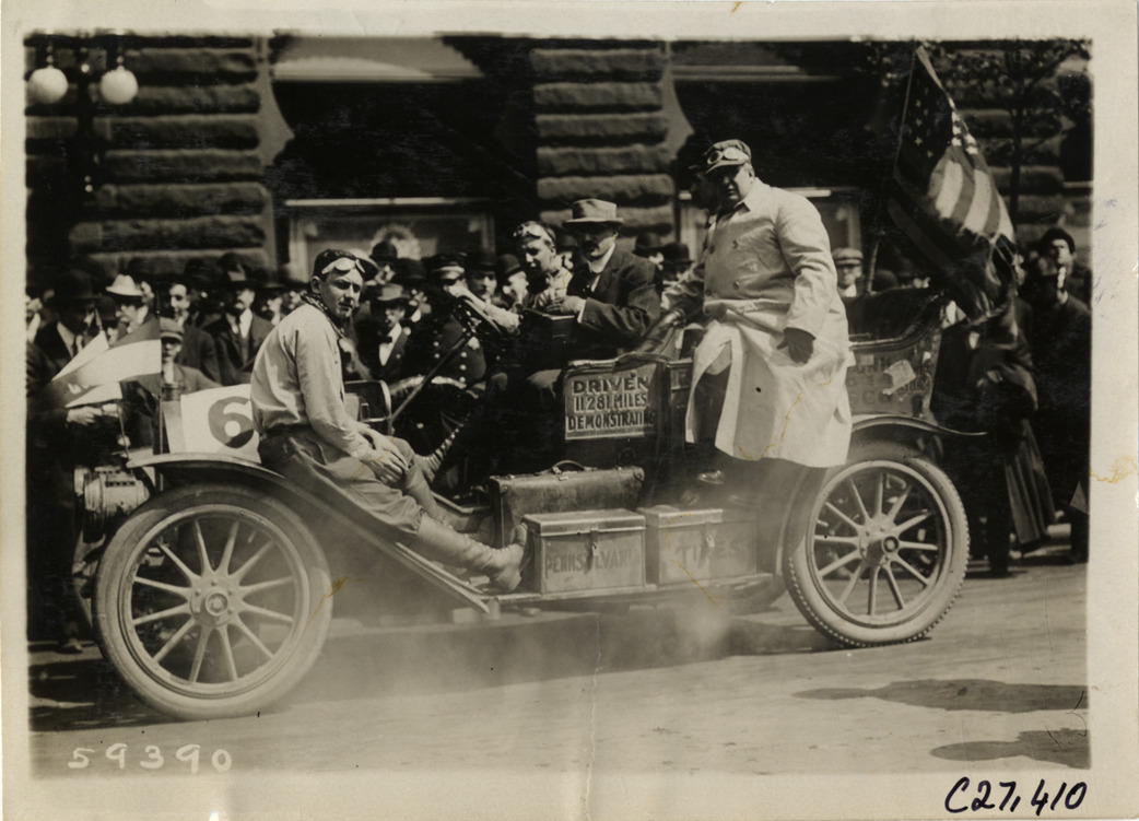 View of motorists posing with Regal Plugger car in front of Hotel Walton at Philadelphia, Pennsylvania during the 1910 Quaker City Motor Club Roadability Run. The endurance contest covered a route from Philadelphia, Pennsylvania to Atlantic City, New Jersey. Stamped on back: "Spooner & Wells, Inc., photographers, telephones 3472-3473 Columbus, 1931 Broadway, New York." Handwritten on back: "Regal Plugger. Tours--Quaker City Motor Club Roadability Run, 1910."