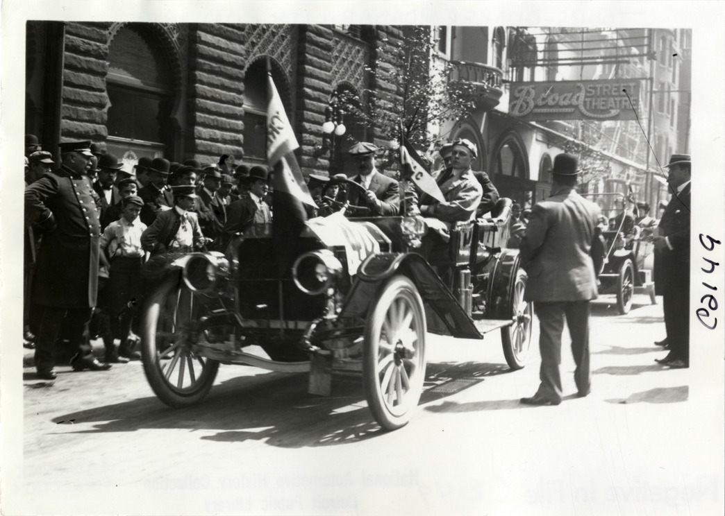 View of motorists in Warren-Detroit car no. 40 in front of Hotel Walton and Broad Street Theatre at Philadelphia, Pennsylvania during the 1910 Quaker City Motor Club Roadability Run. The endurance contest covered a route from Philadelphia, Pennsylvania to Atlantic City, New Jersey. Handwritten on back: "#40 Warren-Detroit, Charles Rudd. Tours--Quaker City Motor Club Roadability Run, 1910."