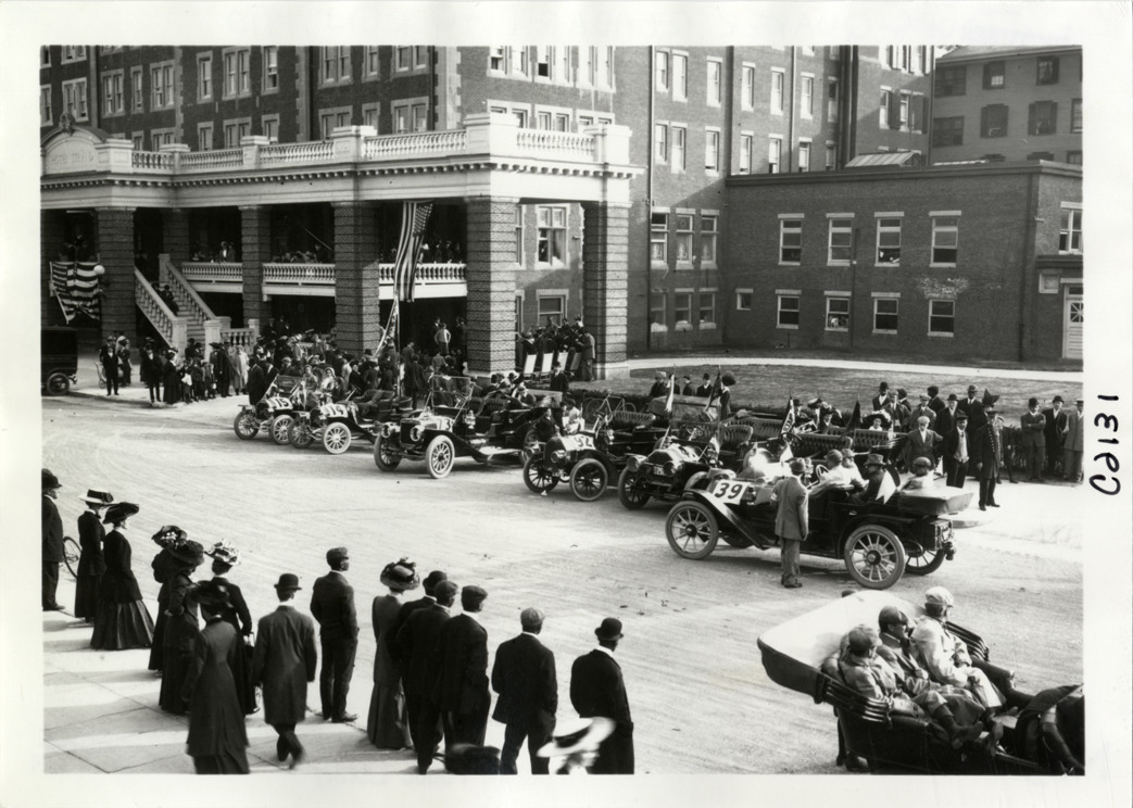View of cars parked in front of the Hotel Strand at Atlantic City, New Jersey during the 1910 Quaker City Motor Club Roadability Run. The endurance contest covered a route from Philadelphia, Pennsylvania to Atlantic City, New Jersey. Handwritten on back: "#15 Buick, 14 Buick, 73 Winton, 92 Dragon, 41 Peerless, 39 Chalmers. Tours--Quaker City Motor Club Roadability Run, 1910."