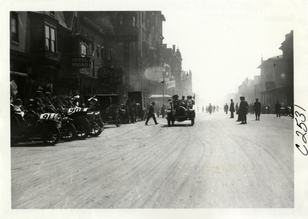 View of motorists traveling in car at Philadelphia, Pennsylvania during the 1910 Quaker City Motor Club Roadability Run. Cars no. 90 and no. 91 are parked along curb. The endurance contest covered a route from Philadelphia, Pennsylvania to Atlantic City, New Jersey. Handwritten on back: "Tours--Quaker City Motor Club Roadability Run, 1910."
