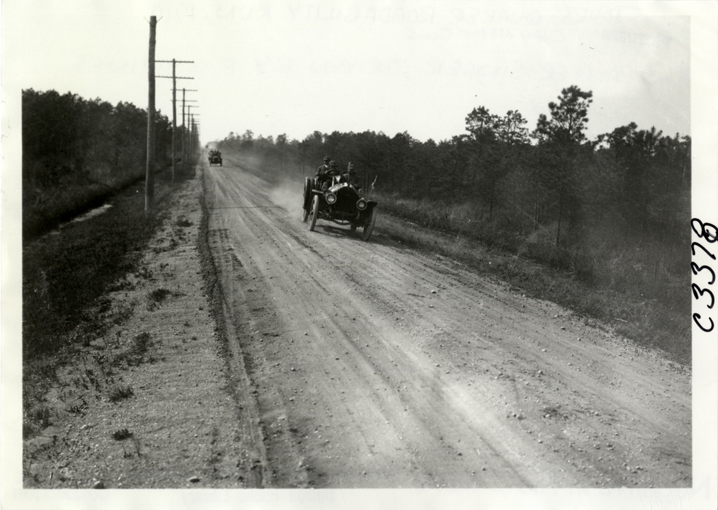 View of motorists in Palmer-Singer car traveling on rural dirt road during the 1910 Quaker City Motor Club Roadability Run. The endurance contest covered a route from Philadelphia, Pennsylvania to Atlantic City, New Jersey. Handwritten on back: "#63 Palmer-Singer, driven by E.M. Haines. Tours--Quaker City Motor Club Roadability Run, 1910."
