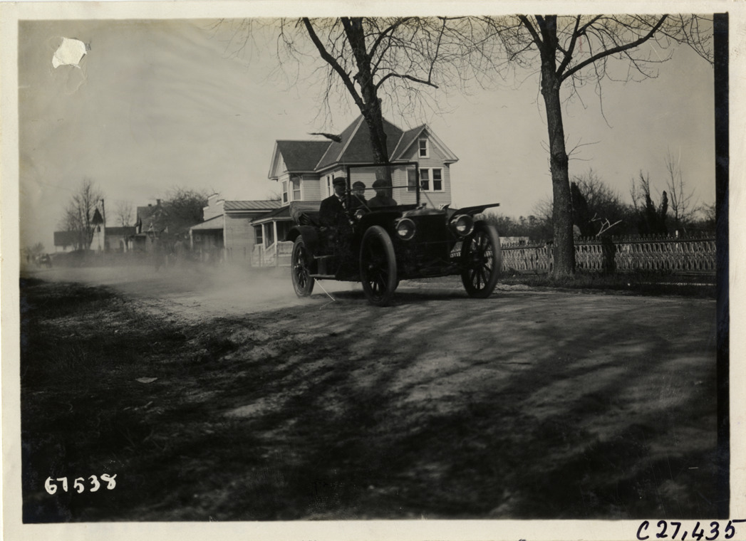 View of J.R. Mountain and motorists in American Traveler car traveling at Oceanville, New Jersey during the 1911 Quaker City Motor Club Roadability Run. Wooden-frame house and garage on right. The endurance contest covered a route from Philadelphia, Pennsylvania to Atlantic City, New Jersey. Stamped on back: "Spooner & Wells, Inc., photographers, telephones 3472-3473 Columbus, 1931 Broadway, New York." Handwritten on back: "American Traveler #30 driven by J.E. Fountain [sic] on the road at Oceanville. Tours--Quaker City Motor Club Roadability Run, 1911."