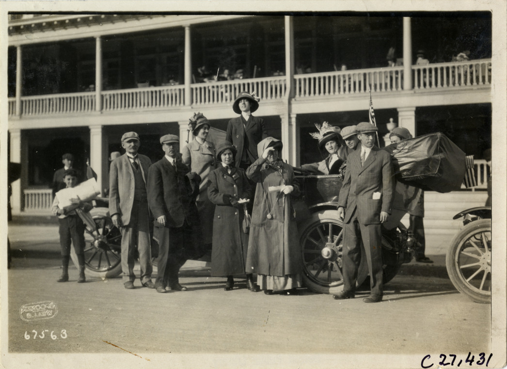 View of Emma Hardart and family posing with Winton car during the 1911 Quaker City Motor Club Roadability Run. The endurance contest covered a route from Philadelphia, Pennsylvania to Atlantic City, New Jersey. Stamped on back: "Spooner & Wells, Inc., photographers, telephones 3472-3473 Columbus, 1931 Broadway, New York." Handwritten on back: "The Hardart family with the Winton #14 driven by Miss Emma Hardart. Tours--Quaker City Motor Club Roadability Run, 1911."