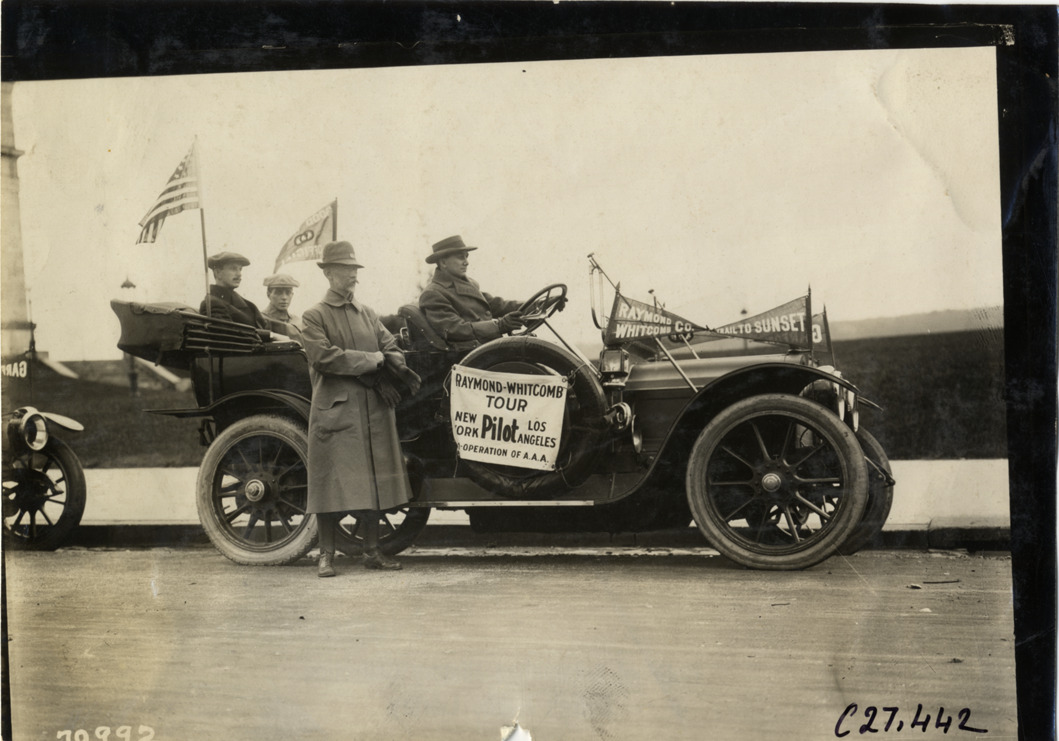 View of A.L. Westgard and motorists posing with Garford pilot car during the 1911 Raymond-Whitcomb Tour. The transcontinental tour covered a route from New York, New York to Los Angeles, California. Stamped on back: "Spooner & Wells, Inc., photographers, telephones 3472-3473 Columbus, 1931 Broadway, New York." Handwritten on back: "Mr. Westgard and pilot car. Tours--Raymond-Whitcomb Tour, 1911."