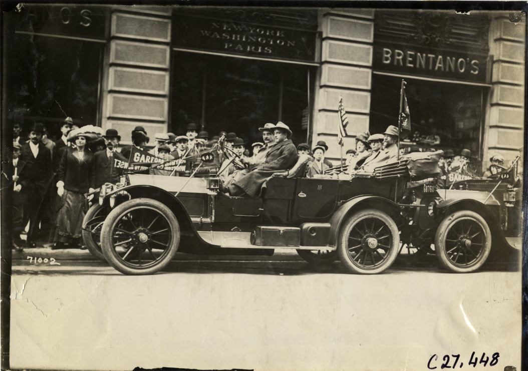 View of Mr. Raymond, Mr. Whitcomb, A.L. Westgard and motorists posing in Garford pilot car during the 1911 Raymond-Whitcomb Tour. The transcontinental tour covered a route from New York, New York to Los Angeles, California. Stamped on back: "Spooner & Wells, Inc., photographers, telephones 3472-3473 Columbus, 1931 Broadway, New York." Handwritten on back: "Mr. Raymond & Mr. Whitcomb, Mr. Westgard in pilot car. Tours--Raymond-Whitcomb Tour, 1911."