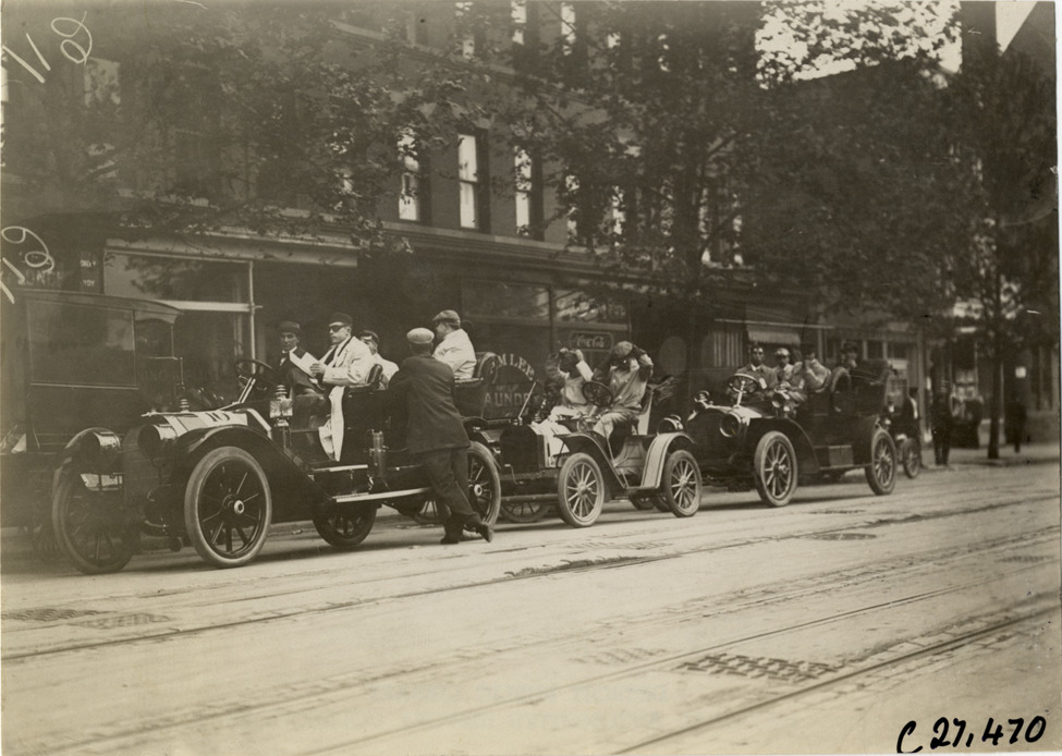 Automobiles lined up in street, 1909 Sealed Bonnet Contest