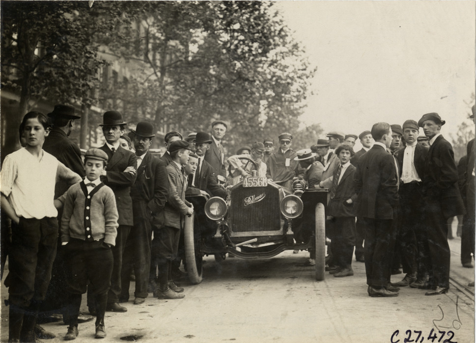 Motorists in Pullman automobile surrounded by spectators, 1909 Sealed Bonnet Contest