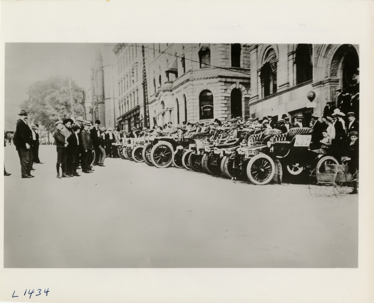 View of cars lined up in street at Albany, New York during the 1904 St. Louis Tour. The tour covered a route across five states from New York, New York to St. Louis, Missouri. Handwritten on back: "In Albany, Story in Sept. '54, AF. Tours--St. Louis Tour, 1904."