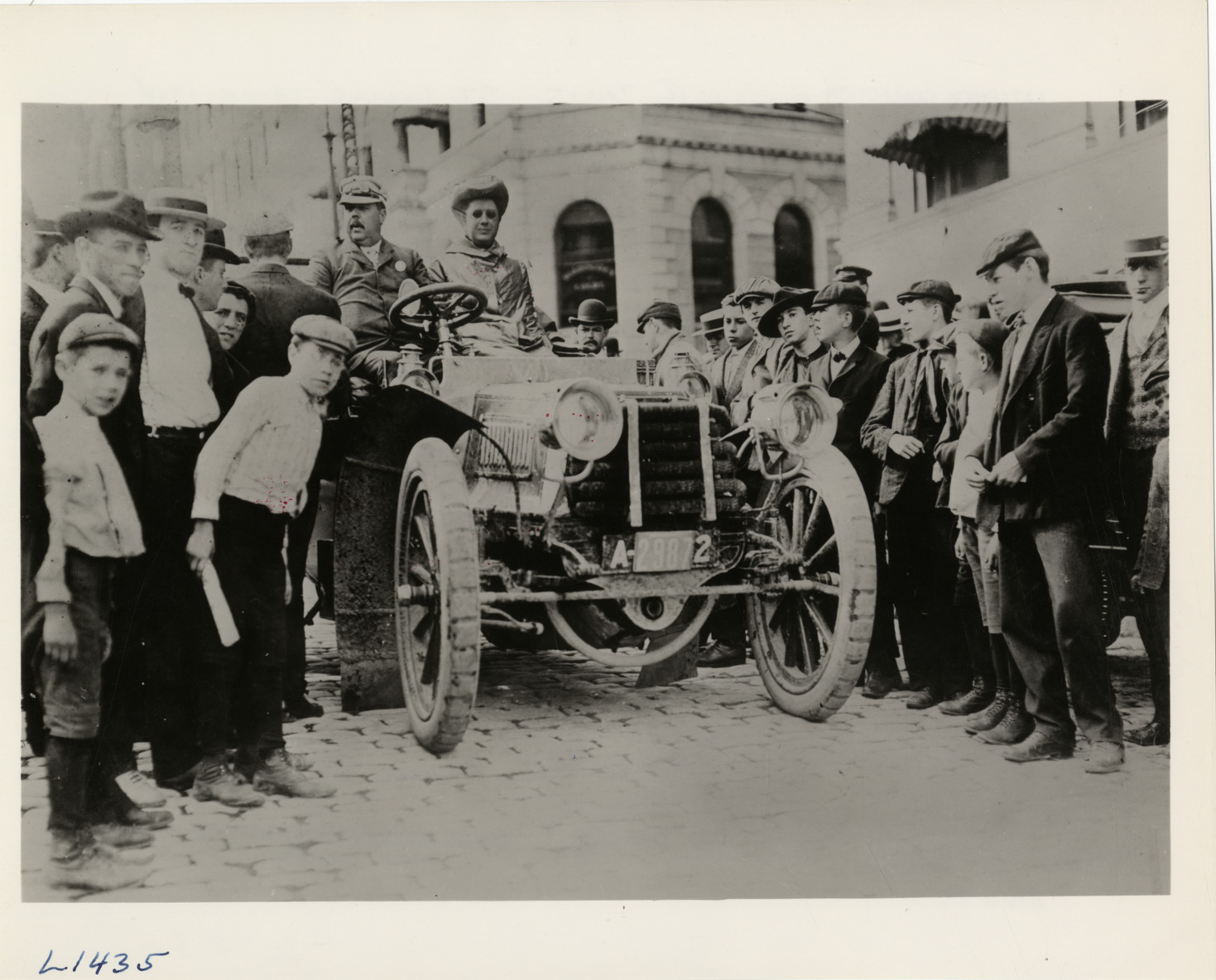 View of Mr. and Mrs. Charles Glidden in Napier car, surrounded by spectators, at Albany, New York during the 1904 St. Louis Tour. The tour covered a route across five states from New York, New York to St. Louis, Missouri. Handwritten on back: "Story in Sept. '54, AF. Tour to St. Louis Fair reaches Albany in July. Mr. & Mrs. Charles E. Glidden in their Napier in which they drove around the world. Tours--St. Louis Tour, 1904."