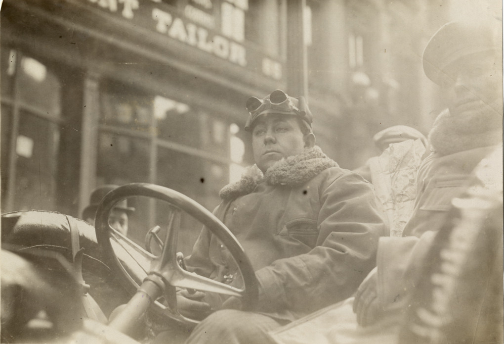 Driver in Thomas Flyer automobile, 1909 New York to Seattle Tour pathfinding expedition