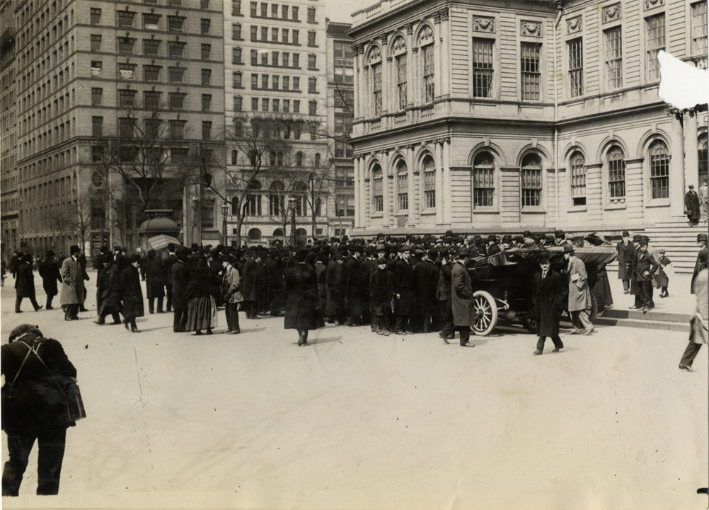 View of crowd gathered in front of New York City Hall during the 1909 New York to Seattle Tour pathfinding expedition. Car is partially visible at edge of crowd. Stamped on back: "Spooner & Wells, Inc., photographers, telephones 3472-3473 Columbus, 1931 Broadway, New York." Handwritten on back: "Tours--Thomas Flyer pathfinder, N.Y. to Seattle Tour, 1909."