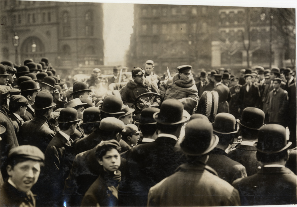 View of crowd surrounding motorists in Thomas Flyer car at New York, New York during the 1909 New York to Seattle Tour pathfinding expedition. Stamped on back: "Spooner & Wells, Inc., photographers, telephones 3472-3473 Columbus, 1931 Broadway, New York." Handwritten on back: "Thomas car. Miller driving NY to Seattle pathfinding trip, start in NY, 3/20/09. Tours--Thomas Flyer pathfinder, N.Y. to Seattle Tour, 1909."