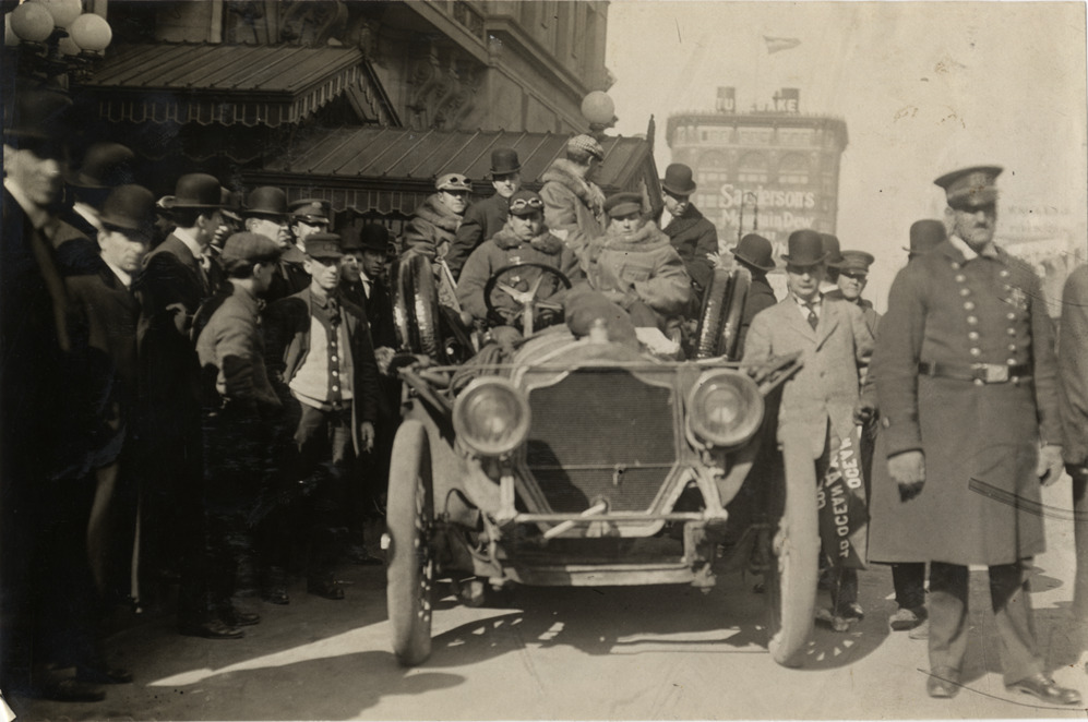 View of motorists in Thomas Flyer car, surrounded by spectators, during the 1909 New York to Seattle Tour pathfinding expedition. Policeman stands in foreground. Handwritten on back: "Tours--Thomas Flyer pathfinder, N.Y. to Seattle Tour, 1909."