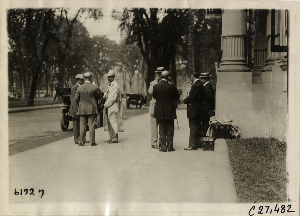 View of A.L. Westgard and other motorists standing in front of the Elton Hotel at Waterbury, Connecticut during the 1910 Owners' Sociability Run sponsored by the Touring Club of America. The run covered a route from New York, New York to Waterbury, Connecticut. Stamped on back: "Spooner & Wells, Inc., photographers, telephones 3472-3473 Columbus, 1931 Broadway, New York." Handwritten on back: "Tours--Touring Club of America tour, 1910."