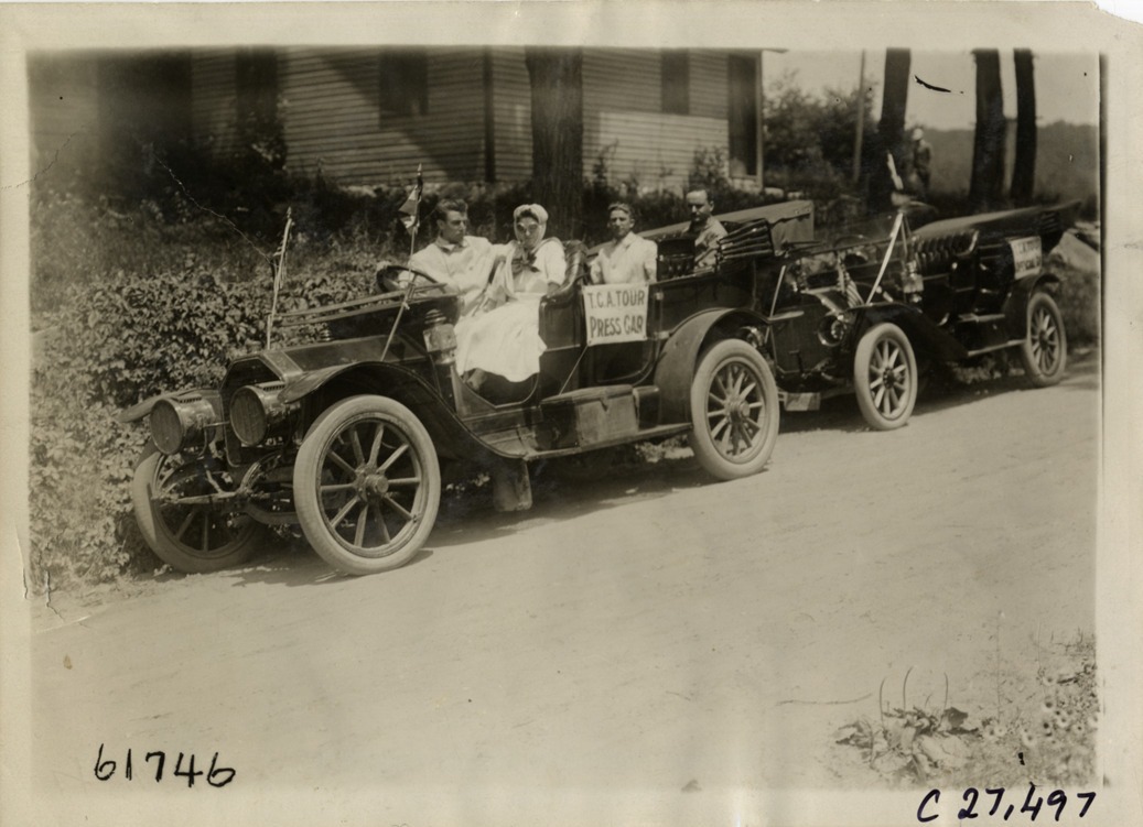 Motorists posing in press automobile, 1910 Touring Club of America Owners' Sociability Run