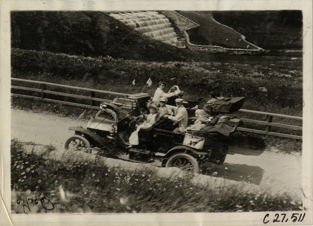 View of motorists in Premier car no. 17 posing on road next to waterfall during the 1910 Owners' Sociability Run sponsored by the Touring Club of America. The run covered a route from New York, New York to Waterbury, Connecticut. Stamped on back: "Spooner & Wells, Inc., photographers, telephones 3472-3473 Columbus, 1931 Broadway, New York." Handwritten on back: "Tours--Touring Club of America tour, 1910."