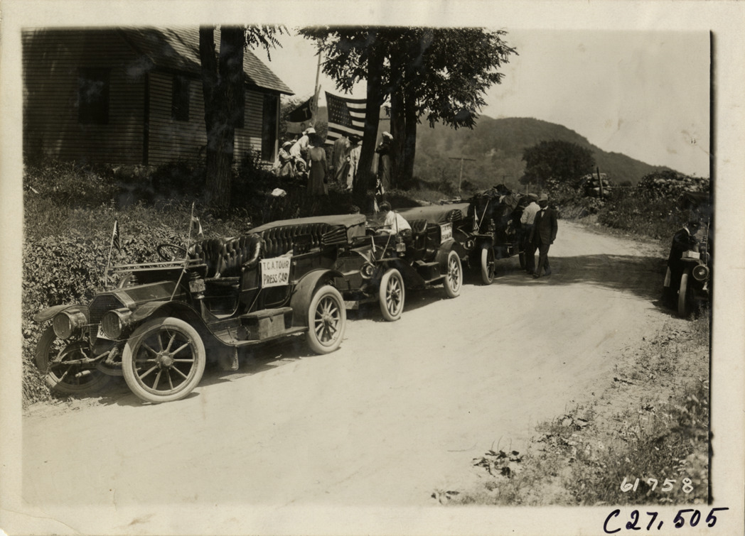 View of cars parked on side of rural dirt road during the 1910 Owners' Sociability Run sponsored by the Touring Club of America. Press car in foreground; wooden-frame house and American flag on roadside. The run covered a route from New York, New York to Waterbury, Connecticut. Stamped on back: "Spooner & Wells, Inc., photographers, telephones 3472-3473 Columbus, 1931 Broadway, New York." Handwritten on back: "Tours--Touring Club of America tour, 1910."