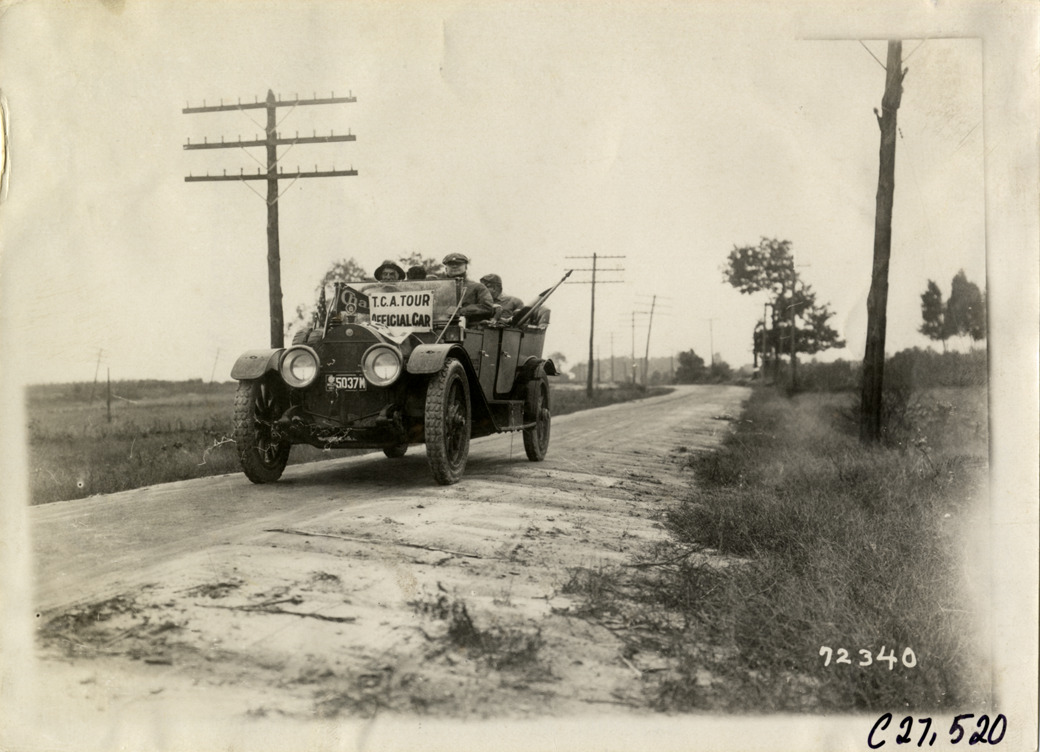 View of motorists in Chalmers car traveling on rural dirt road during the 1911 Good Roads Tour sponsored by the Touring Club of America. The tour covered a route from Atlanta, Georgia to Richmond, Virginia. Stamped on back: "Spooner & Wells, Inc., photographers, telephones 3472-3473 Columbus, 1931 Broadway, New York." Handwritten on back: "Tours--Touring Club of America tour, 1911."