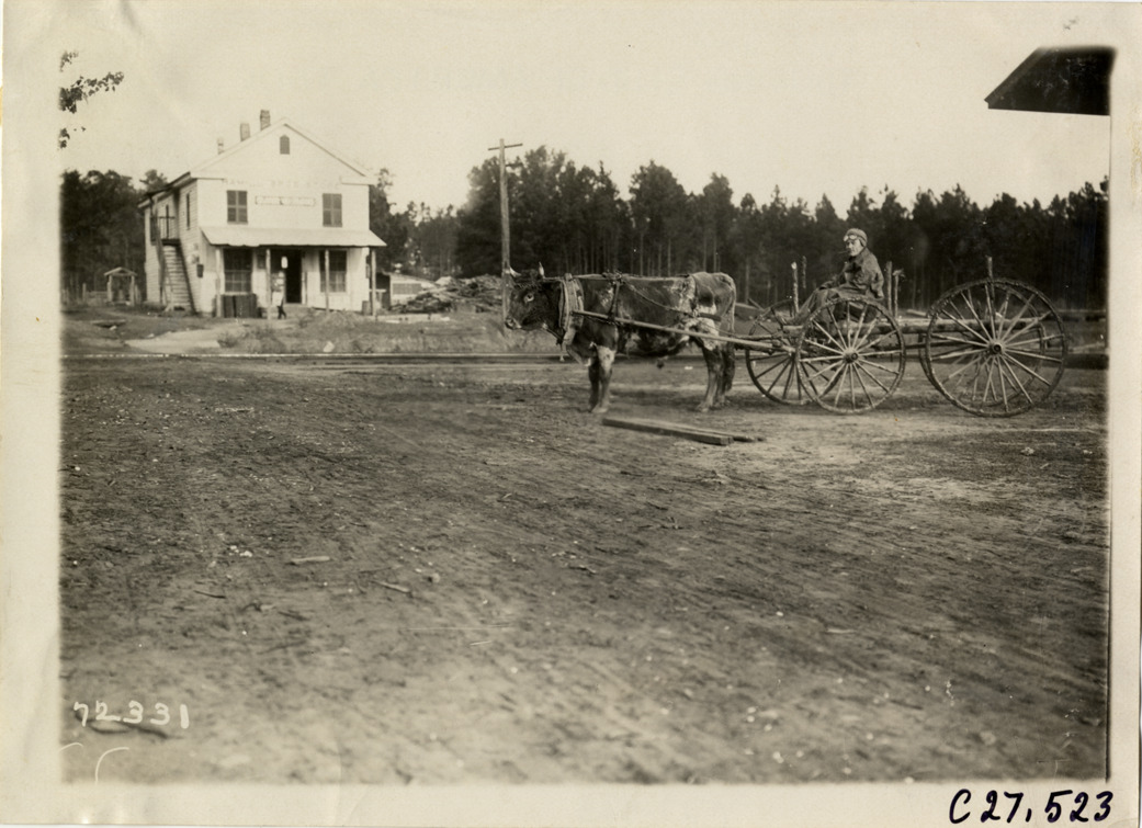 View of man posing in oxcart during the 1911 Good Roads Tour sponsored by the Touring Club of America. Wooden-frame commercial building in background. The tour covered a route from Atlanta, Georgia to Richmond, Virginia. Stamped on back: "Spooner & Wells, Inc., photographers, telephones 3472-3473 Columbus, 1931 Broadway, New York." Handwritten on back: "Tours--Touring Club of America tour, 1911."