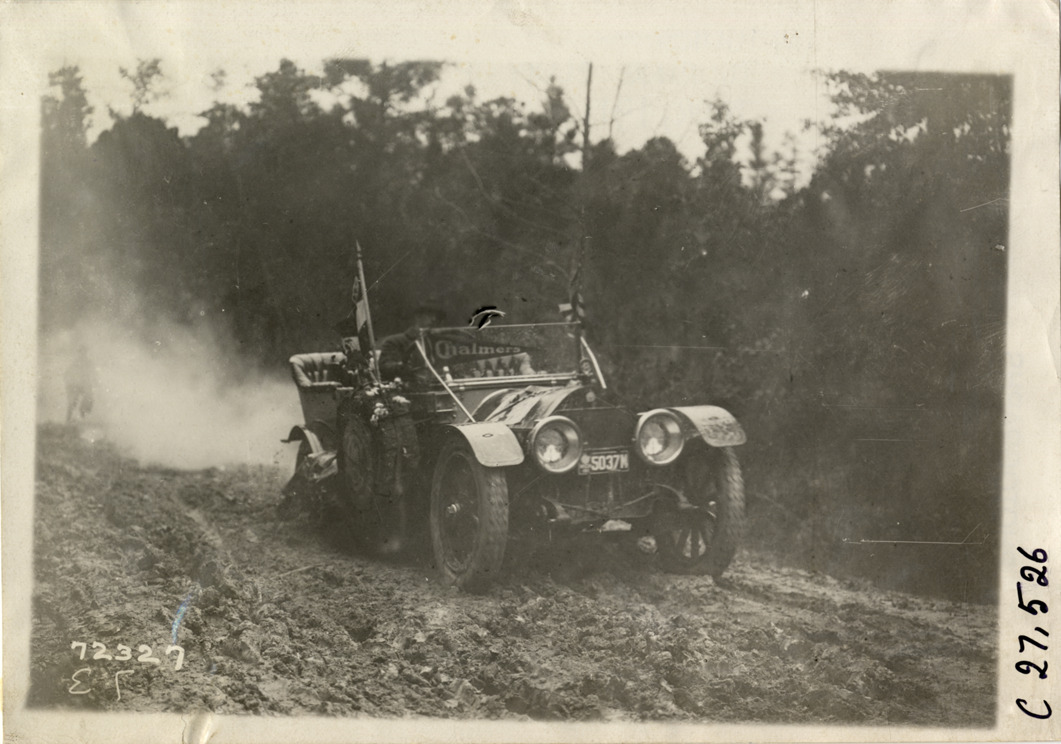 Chalmers automobile on muddy rural road, 1911 Touring Club of America Good Roads Tour