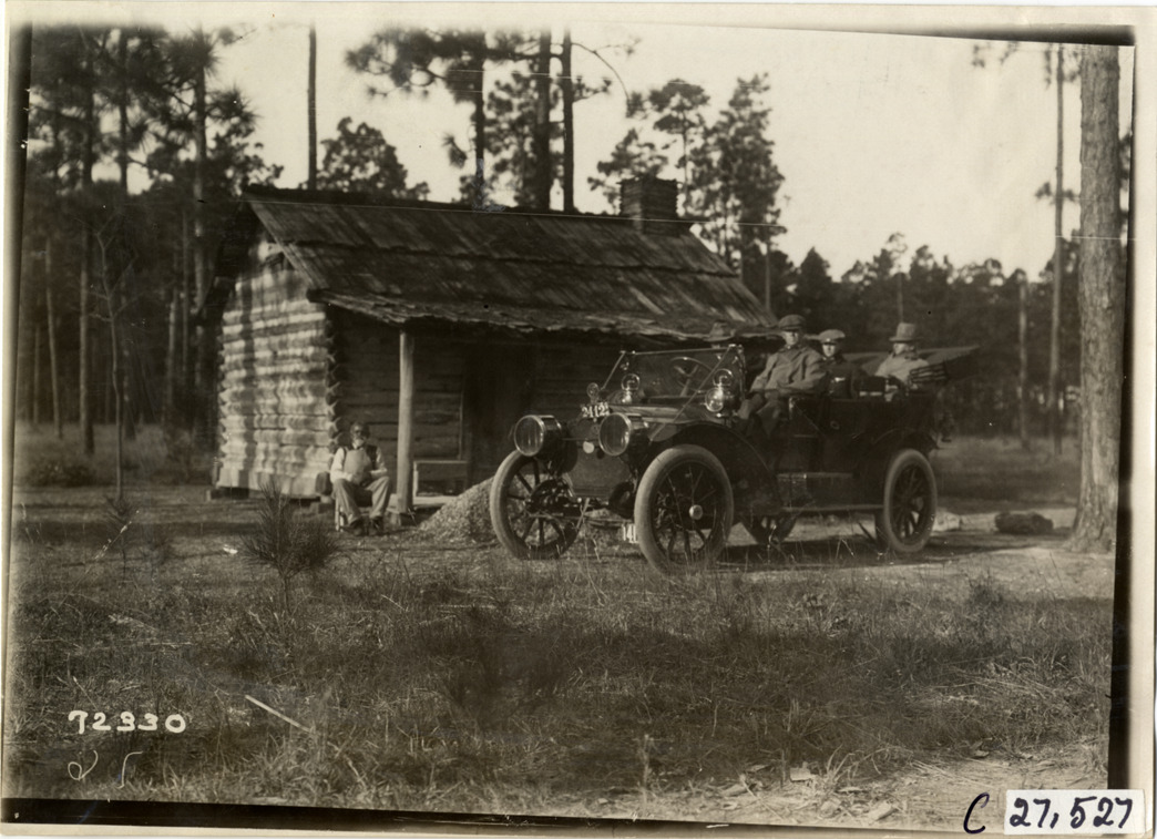 View of motorists posing in car in front of log cabin during the 1911 Good Roads Tour sponsored by the Touring Club of America. Elderly man sits on porch. The tour covered a route from Atlanta, Georgia to Richmond, Virginia. Stamped on back: "Spooner & Wells, Inc., photographers, telephones 3472-3473 Columbus, 1931 Broadway, New York." Handwritten on back: "Tours--Touring Club of America tour, 1911."
