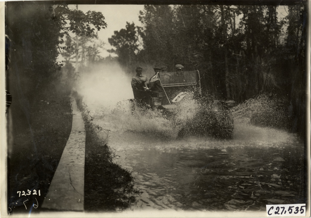 Motorists in Mitchell automobile crossing flooded stretch of road, 1911 Touring Club of America Good Roads Tour