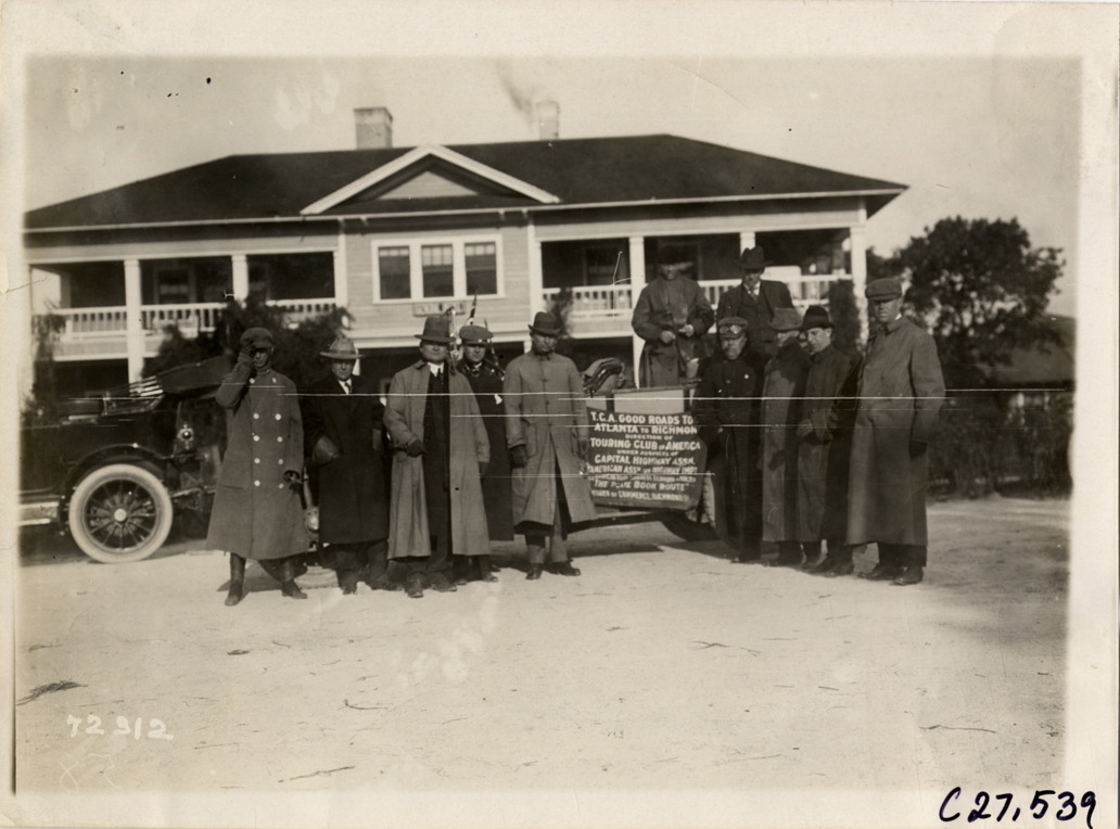 View of Leonard Tufts and motorists posing with Chalmers car during the 1911 Good Roads Tour sponsored by the Touring Club of America. Banner on car reads [in part]: "T.C.A. Good Roads Tour, Atlanta to Richmond, direction of Touring Club of America under auspices of Capital Highway Assn." House in background. The tour covered a route from Atlanta, Georgia to Richmond, Virginia. Stamped on back: "Spooner & Wells, Inc., photographers, telephones 3472-3473 Columbus, 1931 Broadway, New York." Handwritten on back: "Leonard Tufts entertaining. Tours--Touring Club of America tour, 1911."