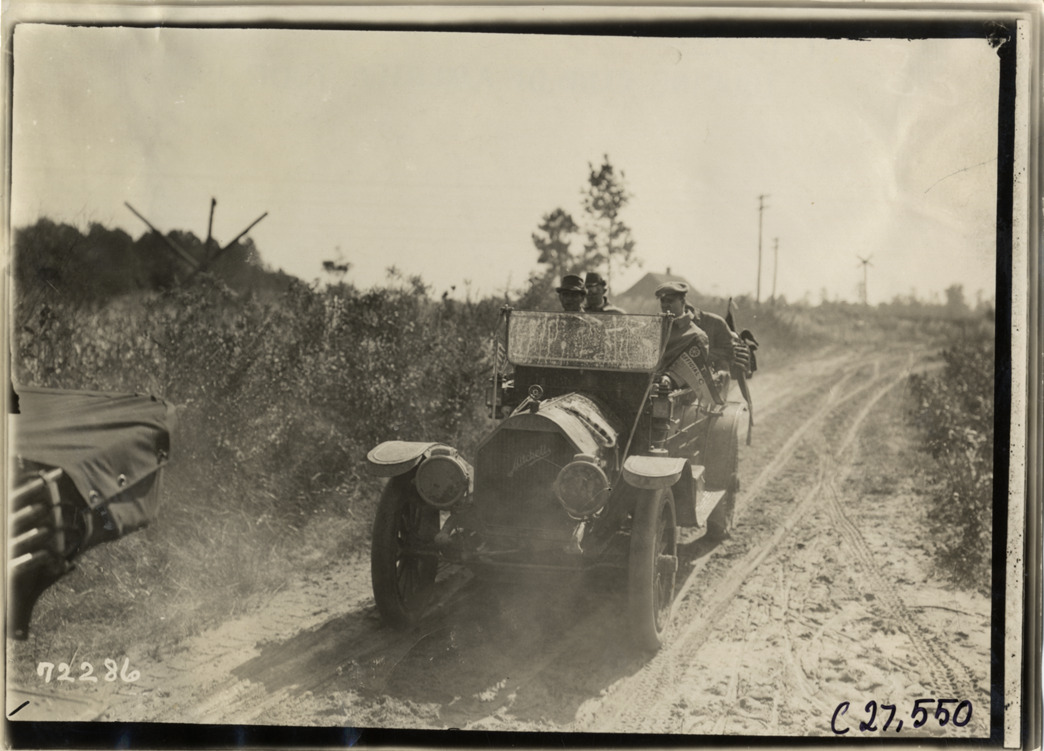 View of motorists in Mitchell car no. 2 traveling on rural dirt road during the 1911 Good Roads Tour sponsored by the Touring Club of America. The tour covered a route from Atlanta, Georgia to Richmond, Virginia. Stamped on back: "Spooner & Wells, Inc., photographers, telephones 3472-3473 Columbus, 1931 Broadway, New York." Handwritten on back: "Tours--Touring Club of America tour, 1911."