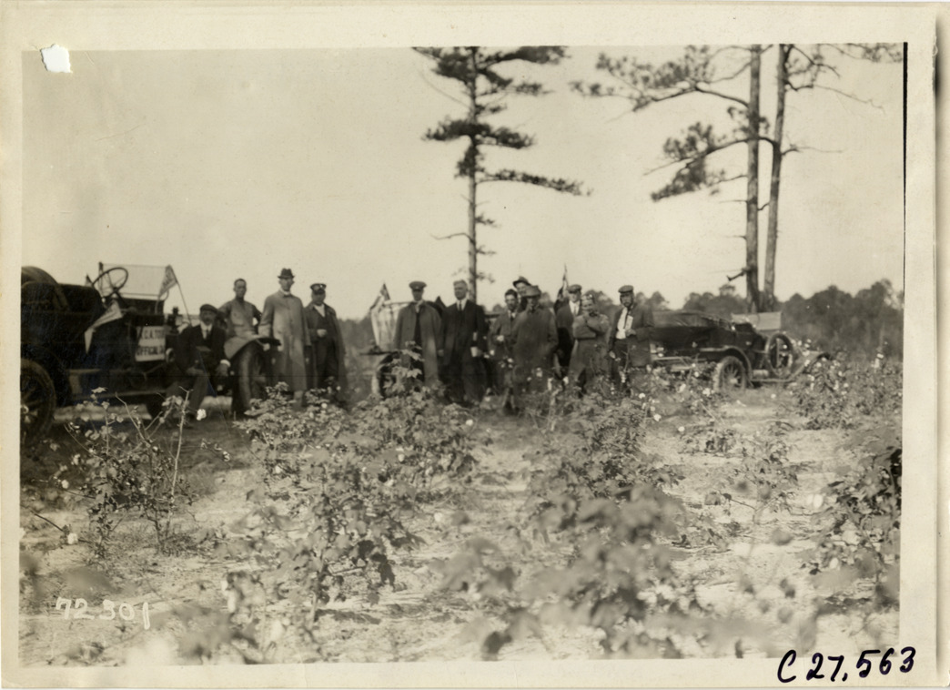 View of motorists posing with cars on roadside during the 1911 Good Roads Tour sponsored by the Touring Club of America. Cotton plants in foreground. The tour covered a route from Atlanta, Georgia to Richmond, Virginia. Stamped on back: "Spooner & Wells, Inc., photographers, telephones 3472-3473 Columbus, 1931 Broadway, New York." Handwritten on back: "Tours--Touring Club of America tour, 1911."