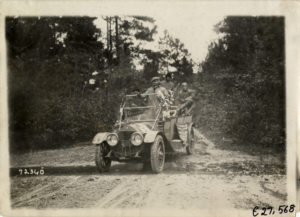 View of motorists posing in Chalmers car no. 1 on forest road during the 1911 Good Roads Tour sponsored by the Touring Club of America. The tour covered a route from Atlanta, Georgia to Richmond, Virginia. Stamped on back: "Spooner & Wells, Inc., photographers, telephones 3472-3473 Columbus, 1931 Broadway, New York." Handwritten on back: "Tours--Touring Club of America tour, 1911."