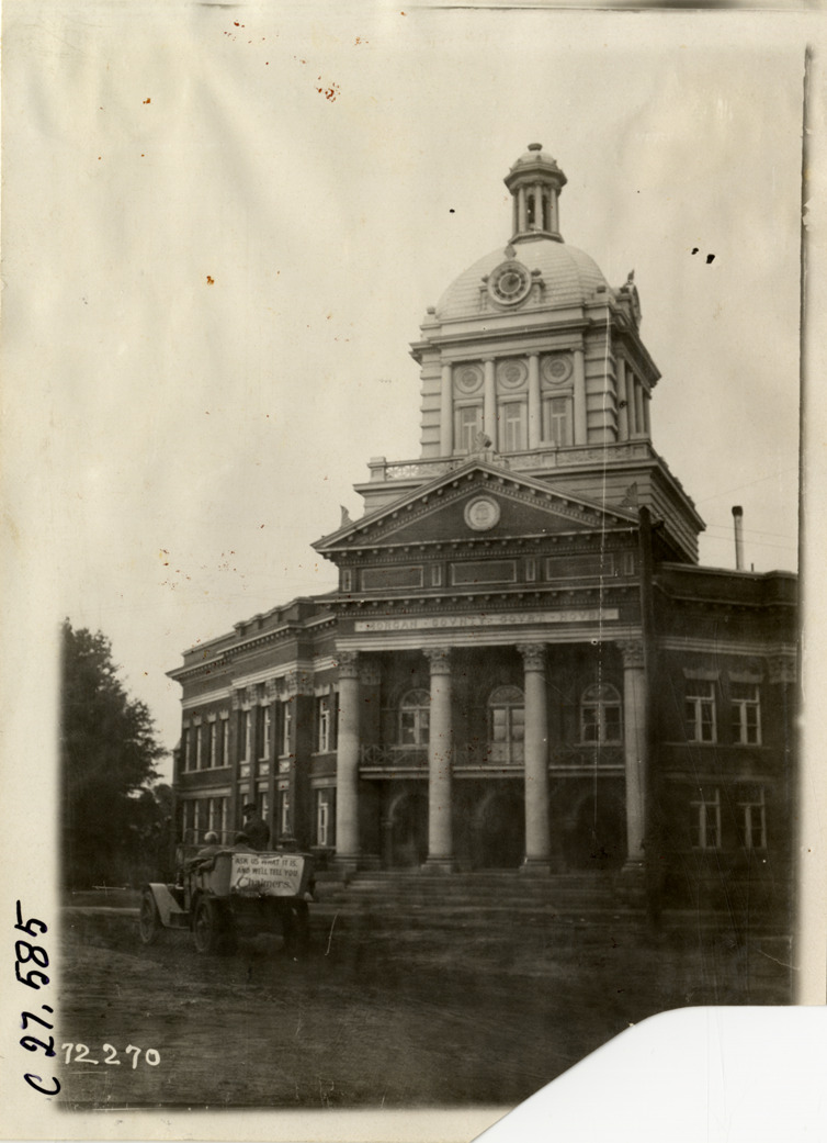 Rear view of motorists in Chalmers car no. 1 in front of Morgan County courthouse at Madison, Georgia during the 1911 Good Roads Tour sponsored by the Touring Club of America. The tour covered a route from Atlanta, Georgia to Richmond, Virginia. Stamped on back: "Spooner & Wells, Inc., photographers, telephones 3472-3473 Columbus, 1931 Broadway, New York." Handwritten on back: "Tours--Touring Club of America tour, 1911."