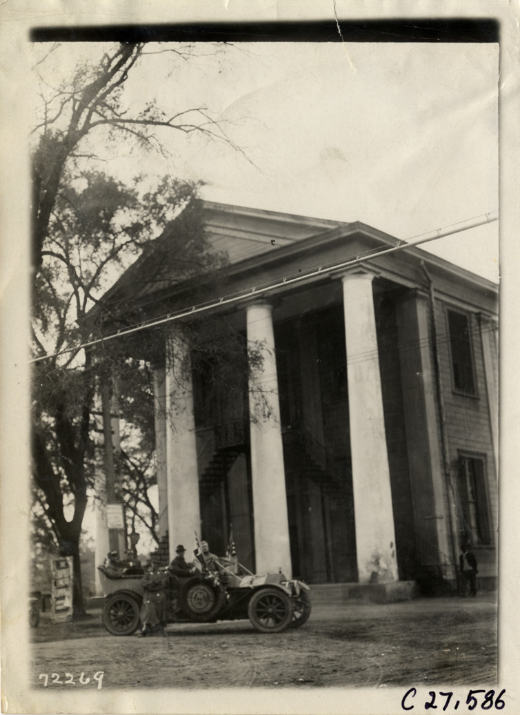 View of motorists in Chalmers car no. 1 stopping in front of Greek Revival style building during the 1911 Good Roads Tour sponsored by the Touring Club of America. Building has full-facade porch supported by Doric columns. The tour covered a route from Atlanta, Georgia to Richmond, Virginia. Stamped on back: "Spooner & Wells, Inc., photographers, telephones 3472-3473 Columbus, 1931 Broadway, New York." Handwritten on back: "Tours--Touring Club of America tour, 1911."