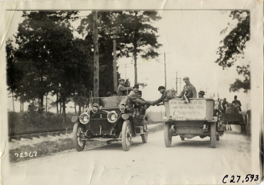 View of motorists in Chalmers car shaking hands with motorists in unidentified car on rural dirt road during the 1911 Good Roads Tour sponsored by the Touring Club of America. The tour covered a route from Atlanta, Georgia to Richmond, Virginia. Stamped on back: "Spooner & Wells, Inc., photographers, telephones 3472-3473 Columbus, 1931 Broadway, New York." Handwritten on back: "Tours--Touring Club of America tour, 1911."