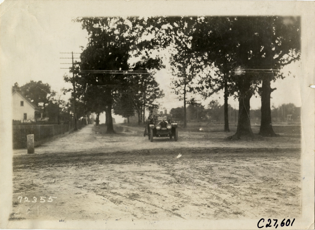 View of motorists in Chalmers car traveling on tree-lined dirt road during the 1911 Good Roads Tour sponsored by the Touring Club of America. House and fence are partially visible on left. The tour covered a route from Atlanta, Georgia to Richmond, Virginia. Stamped on back: "Spooner & Wells, Inc., photographers, telephones 3472-3473 Columbus, 1931 Broadway, New York." Handwritten on back: "Tours--Touring Club of America tour, 1911."