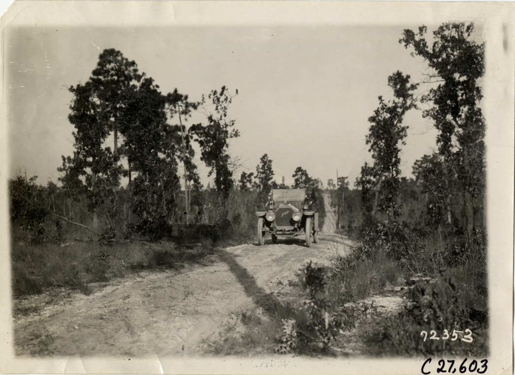 View of motorists in Mitchell car traveling on rural dirt road during the 1911 Good Roads Tour sponsored by the Touring Club of America. The tour covered a route from Atlanta, Georgia to Richmond, Virginia. Stamped on back: "Spooner & Wells, Inc., photographers, telephones 3472-3473 Columbus, 1931 Broadway, New York." Handwritten on back: "Tours--Touring Club of America tour, 1911."