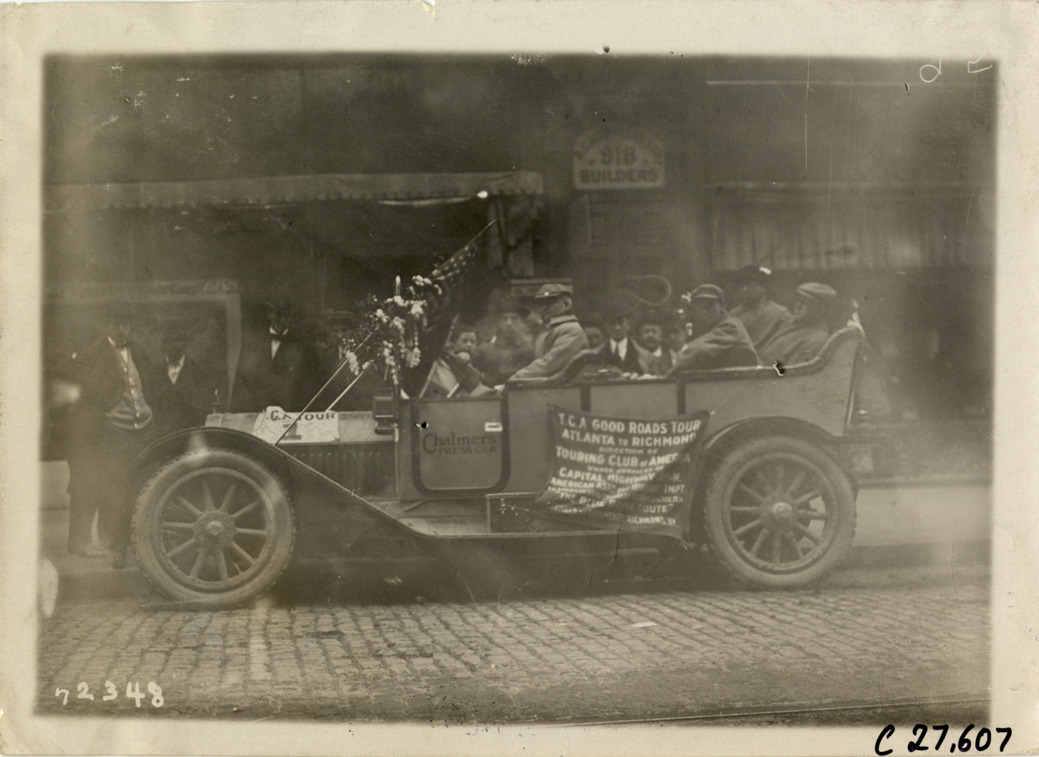 View of motorists posing in Chalmers car no. 1 during the 1911 Good Roads Tour sponsored by the Touring Club of America. The tour covered a route from Atlanta, Georgia to Richmond, Virginia. Stamped on back: "Spooner & Wells, Inc., photographers, telephones 3472-3473 Columbus, 1931 Broadway, New York." Handwritten on back: "Tours--Touring Club of America tour, 1911."