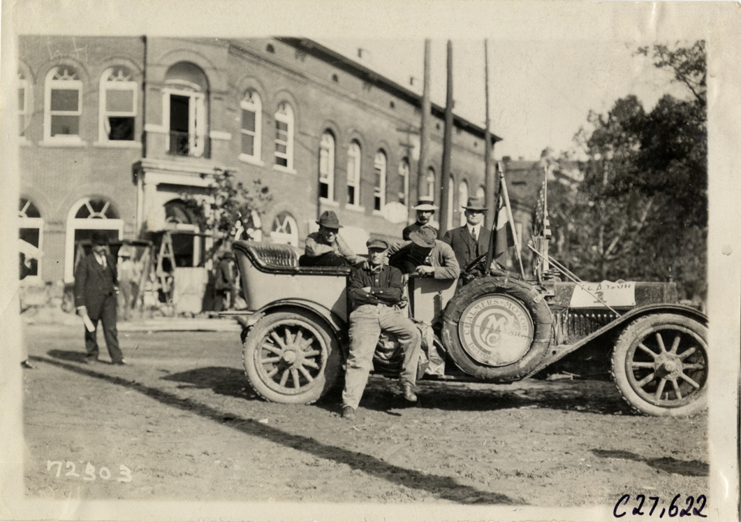 Motorists posing with Chalmers automobile, 1911 Touring Club of America Good Roads Tour