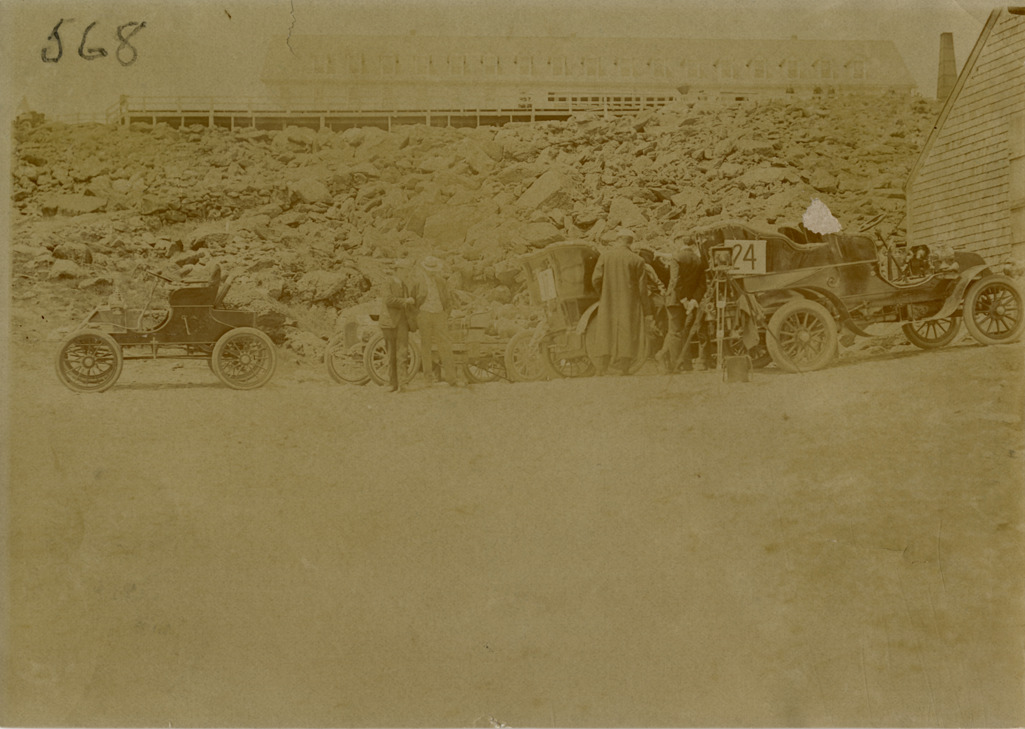 View of cars parked on roadside during the Climb to the Clouds Hill Climb, 1904 White Mountains tour. Car no. 24 on right; camera on tripod in foreground. The events included an endurance run in the White Mountains and the Climb to the Clouds Hill Climb on Mount Washington. Handwritten on back: "Climb to the Clouds Hill Climb up Mt. Washington. Tours--White Mountains tour, 1904."