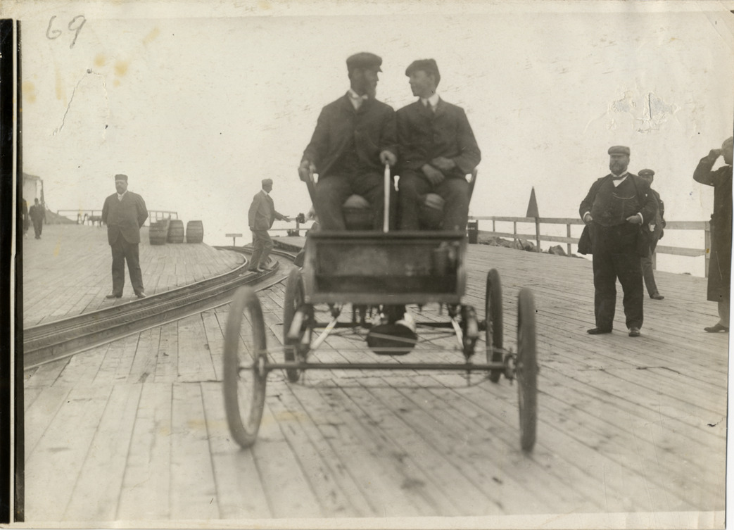 View of F.E. Stanley and passenger in Stanley Steamer car on wooden platform during the 1904 White Mountains tour. Spectators and cog railroad tracks in background. The events included an endurance run in the White Mountains and the Climb to the Clouds Hill Climb on Mount Washington. Handwritten on back: "Tours--White Mountains tour, 1904."
