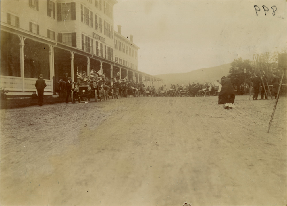 View of cars lined up in front of Fabyan House in the White Mountains during the 1904 White Mountains tour. The events included an endurance run in the White Mountains and the Climb to the Clouds Hill Climb on Mount Washington. Handwritten on back: "Tours--White Mountains tour, 1904." Image is reversed.