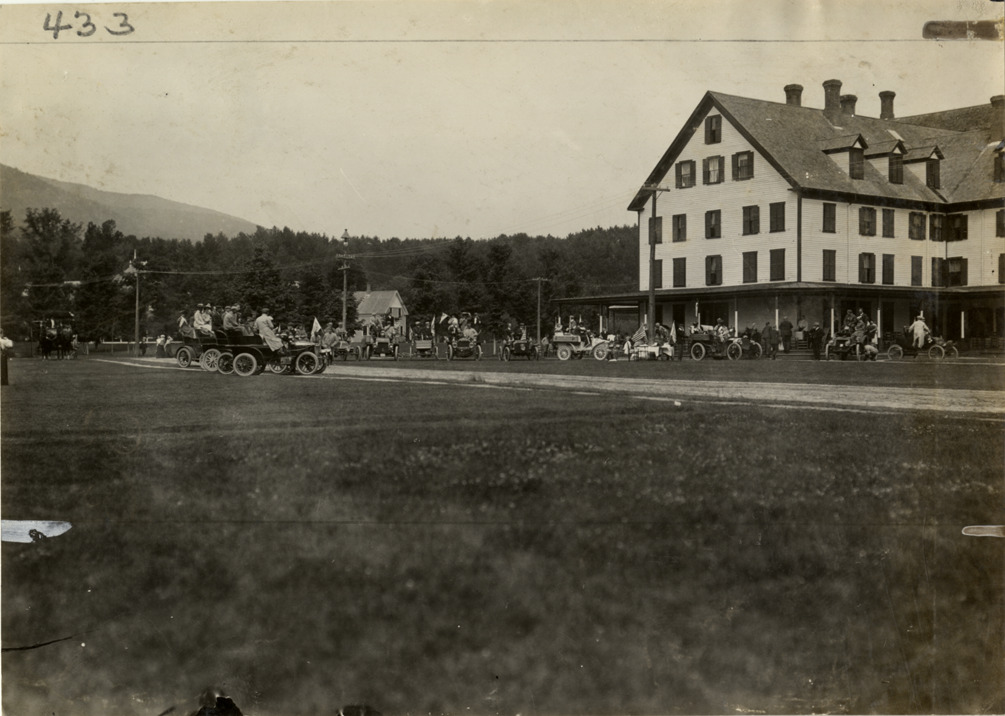 Automobiles parked next to hotel, 1904 White Mountains tour