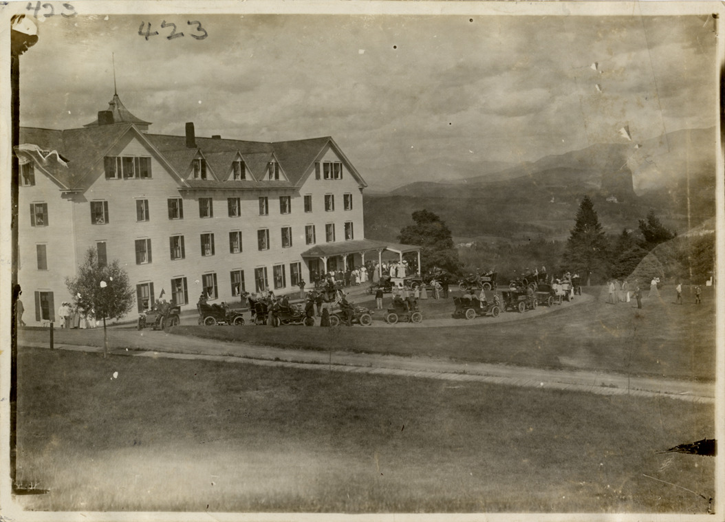 View of cars lined up in front of hotel during the 1904 White Mountains tour. The events included an endurance run in the White Mountains and the Climb to the Clouds Hill Climb on Mount Washington. Handwritten on back: "Tours--White Mountains tour, 1904."