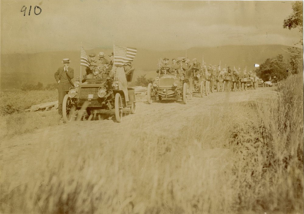 View of cars lined up on mountain road during the 1904 White Mountains tour. Cars are decorated with American flags. The events included an endurance run in the White Mountains and the Climb to the Clouds Hill Climb on Mount Washington. Handwritten on back: "Tours--White Mountains tour, 1904."