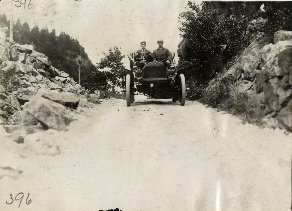 View of Percy Pierce and passenger in Pierce Great Arrow car traveling on mountain road during the 1904 White Mountains tour. The events included an endurance run in the White Mountains and the Climb to the Clouds Hill Climb on Mount Washington. Handwritten on back: "Pierce Great Arrow driven by Percy Pierce, Spooner, Percy Pierce in Great Arrow, Crawford Notch. Tours--White Mountains tour, 1904."