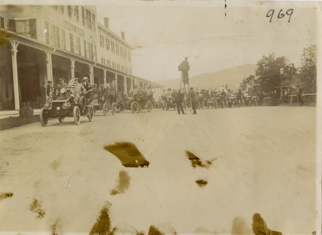 View of cars lined up in front of Fabyan House in the White Mountains during the 1904 White Mountains tour. Photographer stands on ladder. The events included an endurance run in the White Mountains and the Climb to the Clouds Hill Climb on Mount Washington. Handwritten on back: "Tours--White Mountains tour, 1904." Image is reversed.
