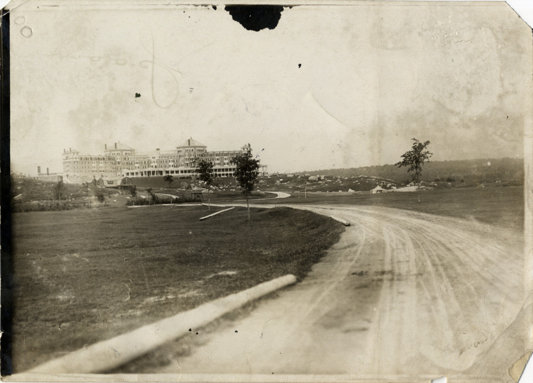 Distant view of the Mount Washington Hotel at Bretton Woods, New Hampshire during the Climb to the Clouds Hill Climb, 1904 White Mountains tour. The events included an endurance run in the White Mountains and the Climb to the Clouds Hill Climb on Mount Washington. Handwritten on back: "Hill climbs, Climb to the Clouds, 1904. Mount Washington Hotel, Bretton Woods, N.H. Spooner, Mt. Washington Hotel. Part of the White Mountains tour, 1904."