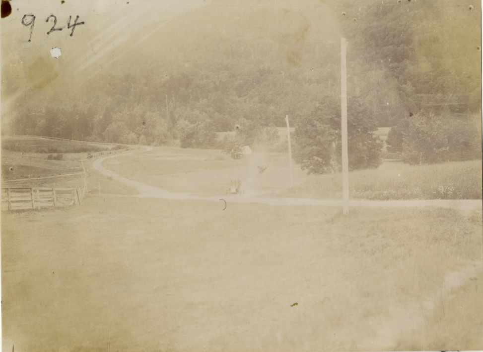 Distant view of car traveling on rural road at Bretton Woods, New Hampshire during the Climb to the Clouds Hill Climb, 1904 White Mountains tour. The events included an endurance run in the White Mountains and the Climb to the Clouds Hill Climb on Mount Washington. Handwritten on back: "Hill climbs, Climb to the Clouds, 1904. Bretton Woods, N.H. Part of White Mountains tour, 1904."