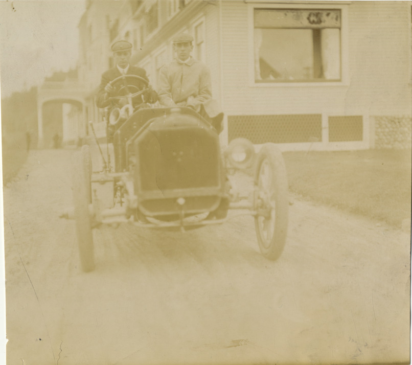 H.E. Rogers and passenger in Peerless automobile, Bretton Woods, New Hampshire, 1904 White Mountains tour